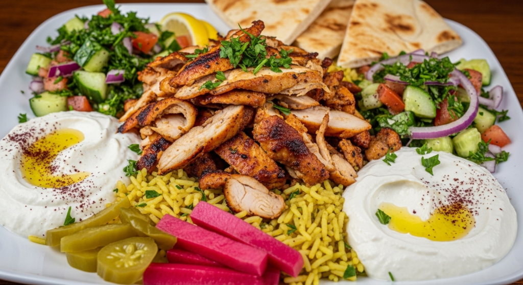 There is a specific, intoxicating aroma that defines the bustling street corners of Beirut, Amman, and Istanbul: the scent of Chicken Shawarma. It is the smell of warm cardamom, pungent garlic, and fat rendering over an open flame. While traditional shawarma is cooked on a vertical rotisserie—slow-turning for hours until the edges become crispy and caramelized—the “Chicken Shawarma Plate” has become a global ambassador for Mediterranean hospitality.