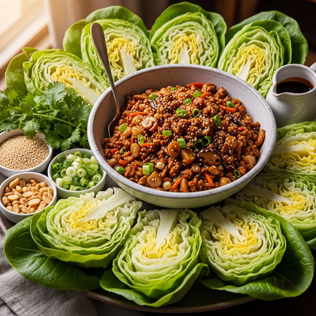 Place a large platter in the center of the table. Arrange the lettuce “cups” in a circular fan pattern around the edge. Transfer the hot filling to a decorative ceramic bowl in the center, allowing guests to build their own wraps.