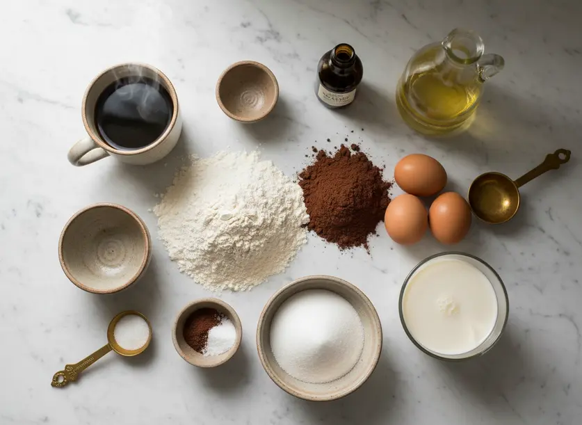 Gathering your ingredients is a crucial first step. You’ll need all-purpose flour; if you’re out, a gluten-free blend designed for baking can work, though the texture might be slightly different. Unsweetened cocoa powder is crucial for that deep chocolate taste—Dutch-processed or natural will both work effectively. Granulated sugar provides sweetness, and baking soda and baking powder are our essential leavening agents, ensuring a perfect fluffy rise. Don’t skip the salt; it balances the flavors perfectly and enhances the chocolate. For the wet ingredients, we’ll use large eggs, buttermilk (or milk mixed with a tablespoon of vinegar or lemon juice for a quick substitute), vegetable oil for extra moisture, and vanilla extract for warmth. And here’s a secret ingredient: hot coffee. It profoundly deepens the chocolate flavor without making the cake taste like coffee. If you don’t drink coffee, hot water works too, but try the coffee if you can for the best Chocolate Cake.