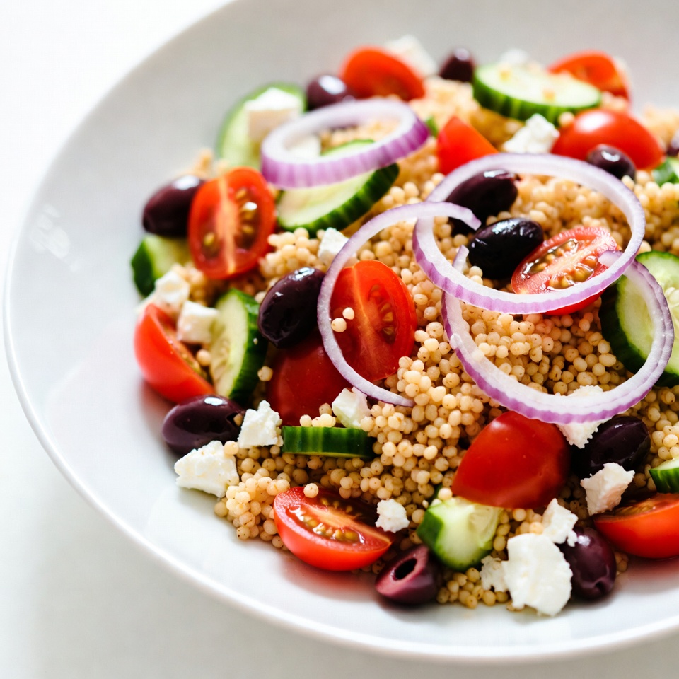 For a rustic, family-style look, serve the salad in a wide, shallow ceramic bowl. Avoid deep bowls where the weight of the ingredients might compress the delicate couscous at the bottom.