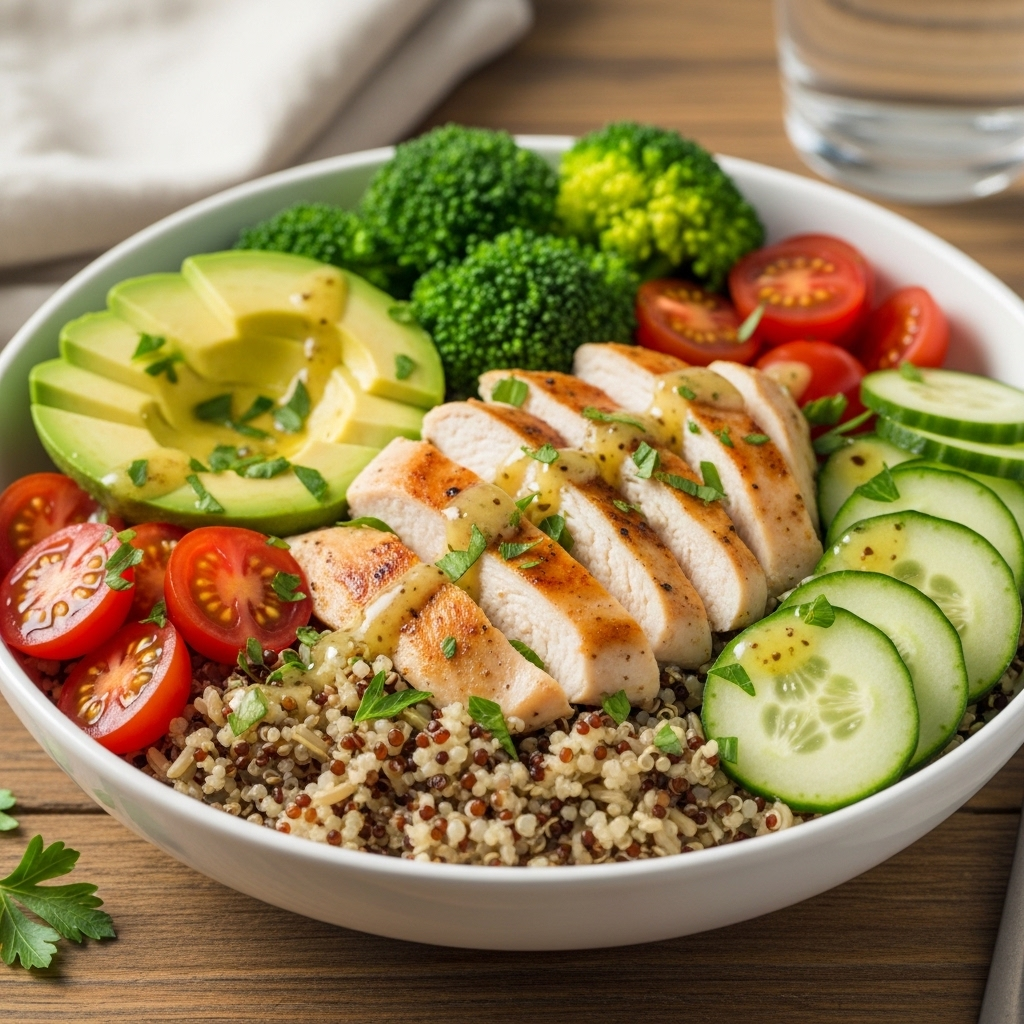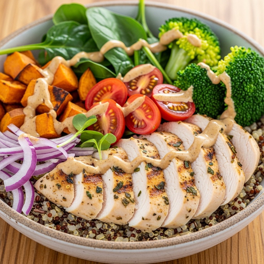 Plating Recommendations: For a “restaurant-style” look, use a wide, shallow bowl rather than a deep one. Start with a base of grains on one side, then arrange the other components in distinct sections moving clockwise. Place the sliced chicken in the center.