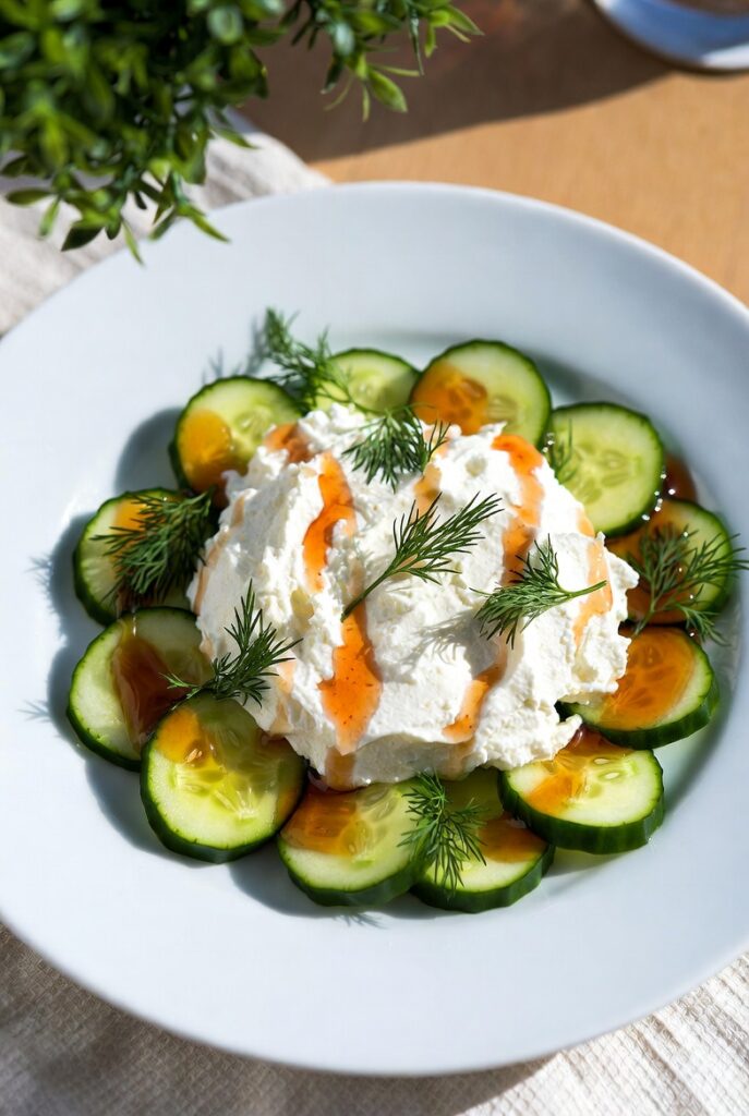 The “Glow” Salad is a contemporary evolution of the classic Mediterranean cucumber and feta pairing. While a traditional Greek salad relies on blocks of feta and a simple vinaigrette, this version deconstructs those elements. By whipping the feta into a cloud-like mousse and introducing the trend-forward heat of hot honey, we transform humble garden vegetables into a restaurant-quality experience.