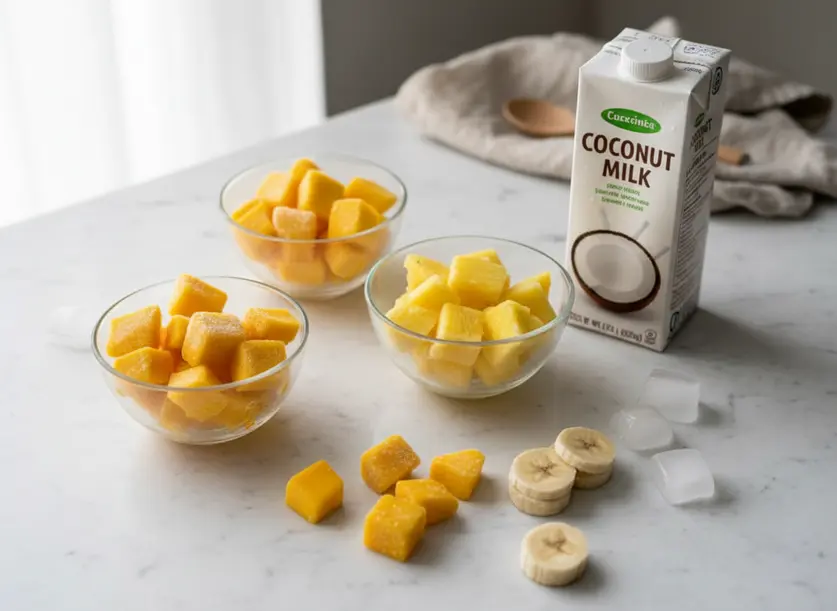 1. Gather Your Ingredients: Start by making sure you have all your frozen mango, pineapple, and banana chunks ready. Measure out your coconut milk and have a few ice cubes on standby if you plan to use them. It’s always easier when everything is prepped before you begin.