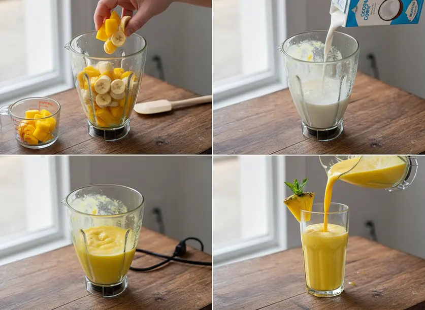 Step-by-step process of blending the mango pineapple smoothie