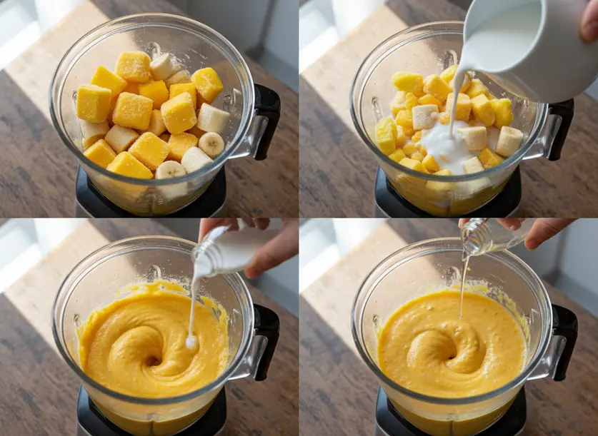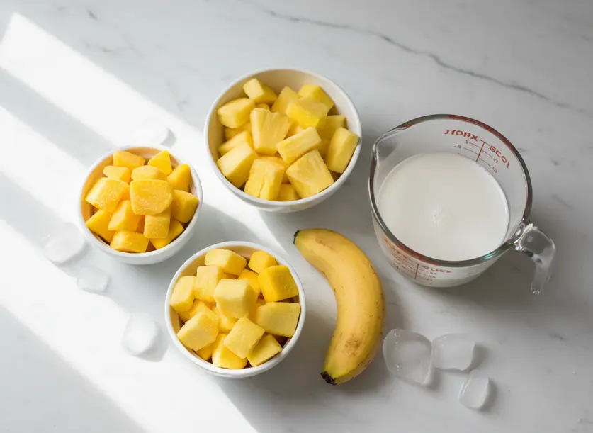 - Gather Your Ingredients: First, lay out all your measured ingredients on your counter. This includes your frozen mango chunks, fresh or frozen pineapple chunks, the small frozen banana (peeled and broken into pieces), your chosen milk, and any optional ice cubes. Having everything ready makes the process much faster.