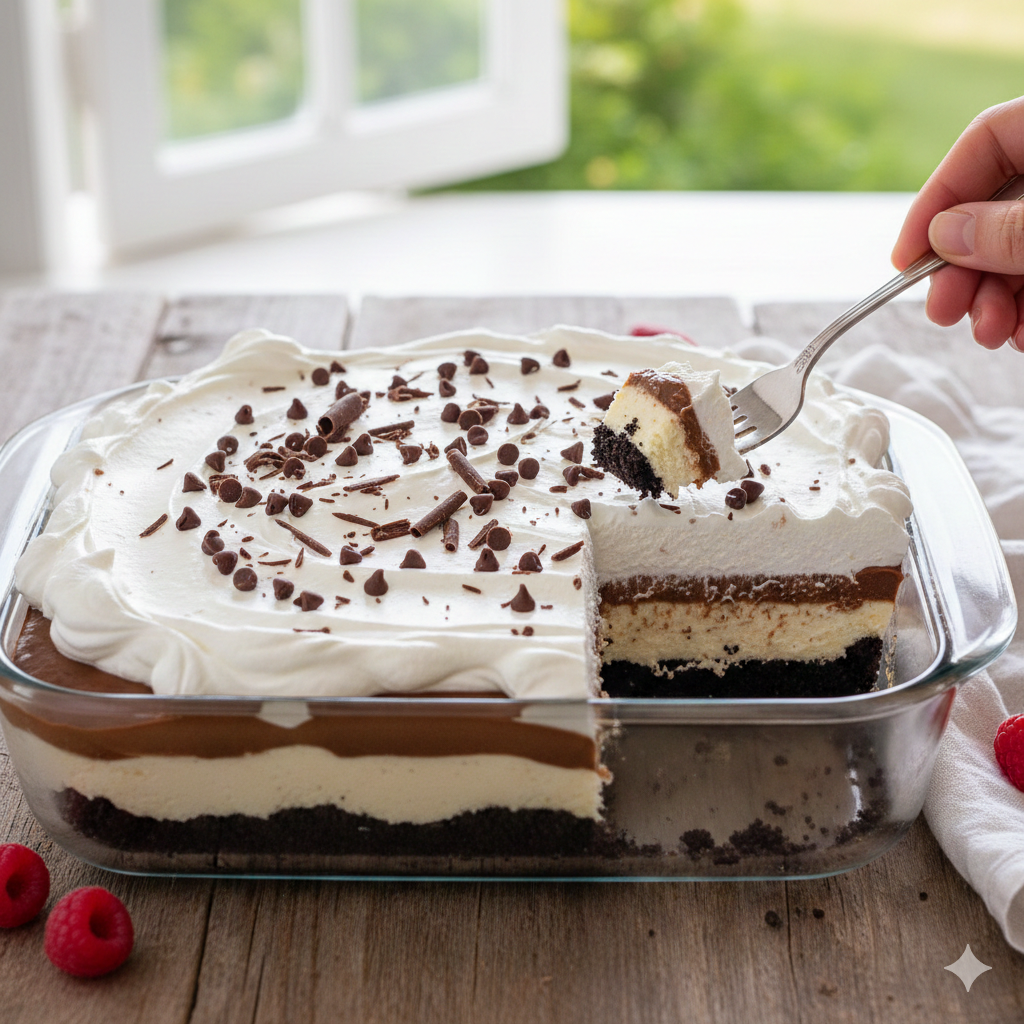 There are desserts that satisfy a craving, and then there are desserts that stop time. The No-Bake Chocolate Lasagna falls firmly into the latter category. Imagine a dessert that marries the crunch of a dark cocoa cookie, the tang of silky cheesecake, the nostalgia of rich chocolate pudding, and the ethereal lightness of fresh whipped cream. It is a visual marvel—a “lasagna” of sweetness that requires absolutely zero time in the oven.