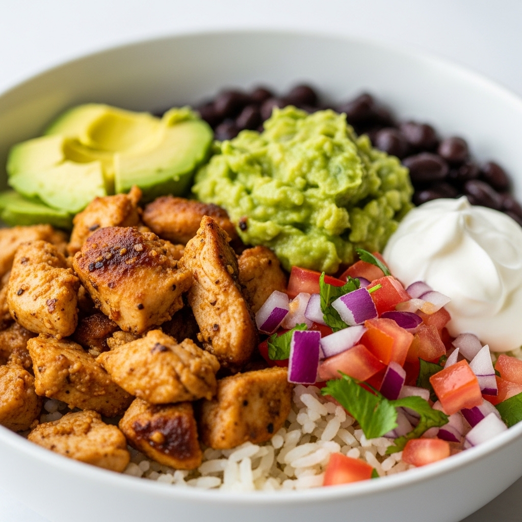 Refrigeration: Store components separately if possible to maintain textures. The chicken and rice will stay fresh in airtight containers for up to 4 days. Freezing: The cooked chicken and plain rice freeze well for up to 2 months. Do not freeze the fresh toppings (avocado, lettuce, sour cream). Reheating: Microwave the rice and chicken with a damp paper towel over the top to retain moisture. Reheat in 30-second intervals until steaming. Add fresh toppings after heating.