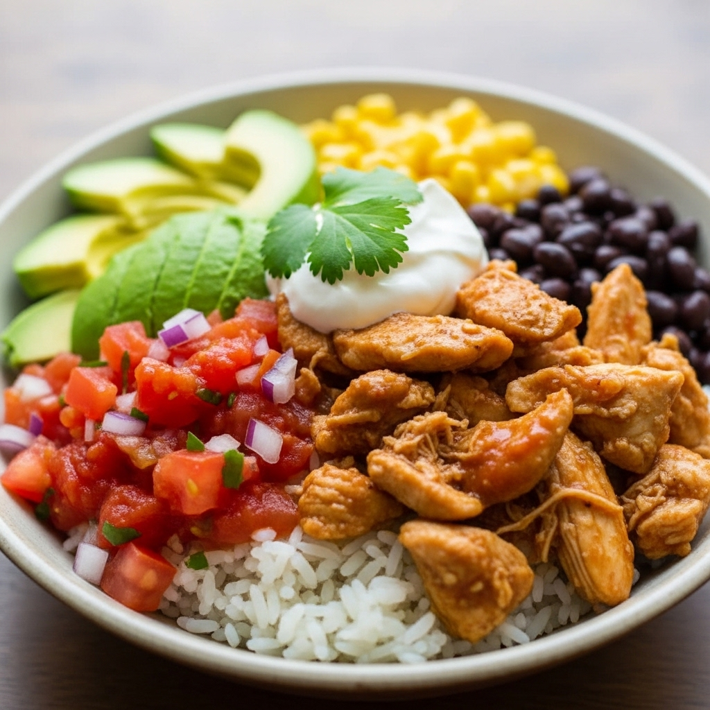 Plating Recommendations: Start with a base of Cilantro Lime Rice on one side of the bowl. Place the sliced chicken in the center. Arrange the beans, corn, and salsa in distinct “sectors” around the chicken to create a visually striking rainbow effect.