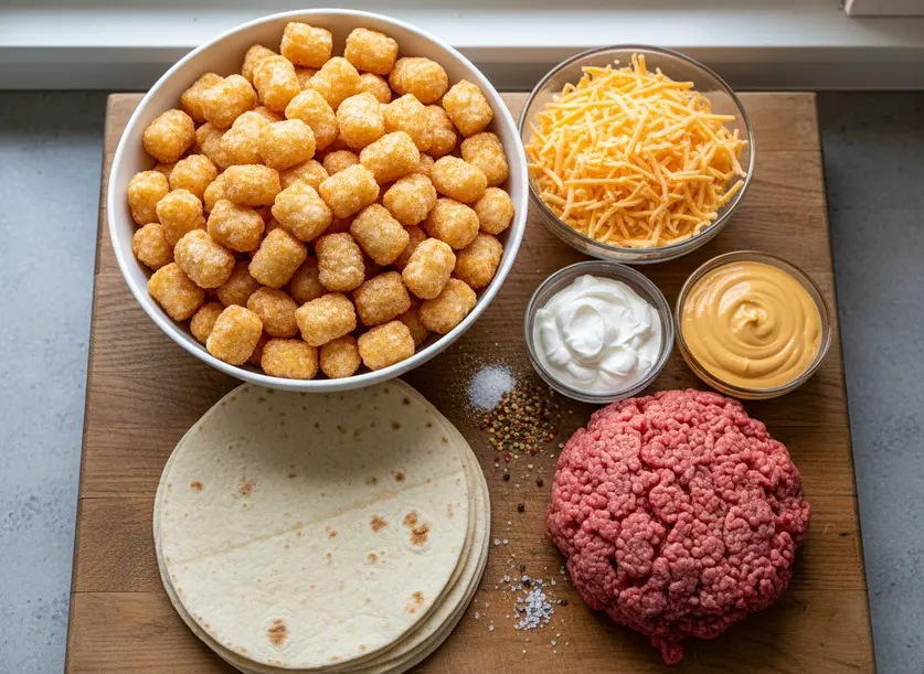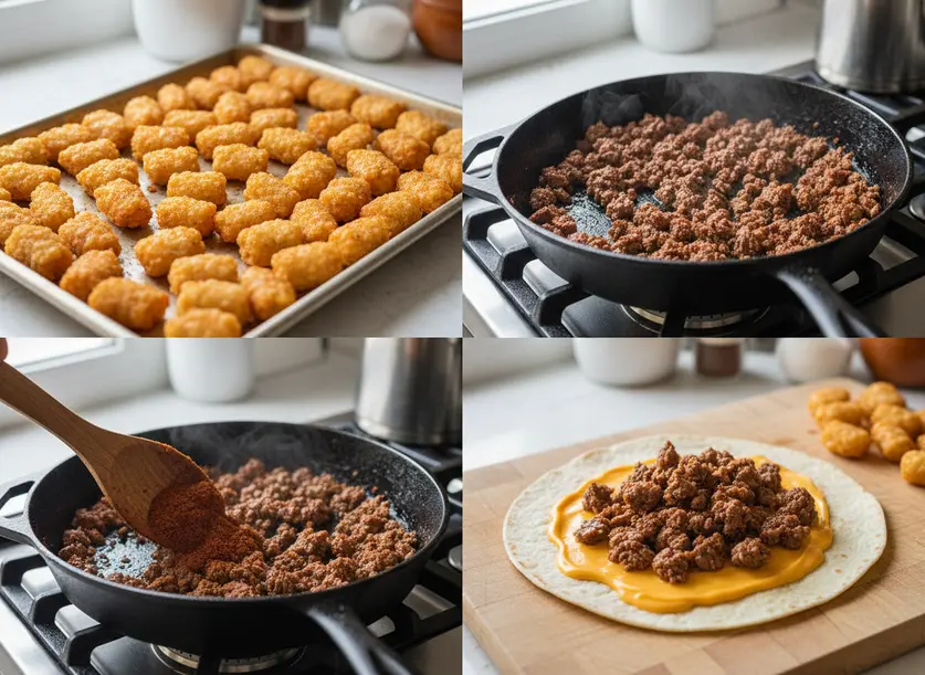For best results, always bake tater tots until golden brown and crispy, and warm tortillas before assembly to prevent tearing. Do not overfill tortillas. Leftover burritos can be wrapped in foil and reheated in a 350°F (175°C) oven for 15-20 minutes to re-crisp; avoid microwaving. Variations include vegetarian (omit beef, double tots, add beans/corn/peppers), spicy (jalapeños/hot sauce), different proteins (shredded chicken, plant-based meat, chili), or extra toppings (pico de gallo, guacamole, caramelized onions, different cheeses). Components can be prepared ahead (beef, tater tots) and stored up to 3 days in the refrigerator; assemble fresh for best texture.