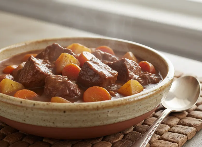 Yes, you can adapt this recipe for a slow cooker. Complete steps 1-6 (browning beef, cooking aromatics, and flour), then transfer everything to your slow cooker. Add the broth, tomatoes, Worcestershire, and bay leaf. Cook on low for 6-8 hours or on high for 3-4 hours, adding carrots and potatoes for the last 1-2 hours.