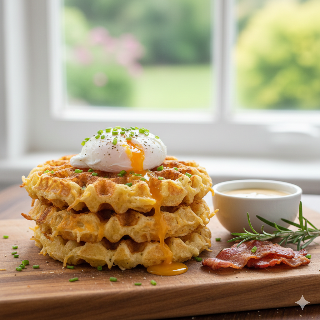 - Plating: Stack two chaffles and top with a poached egg—the runny yolk acts as a luxurious sauce.