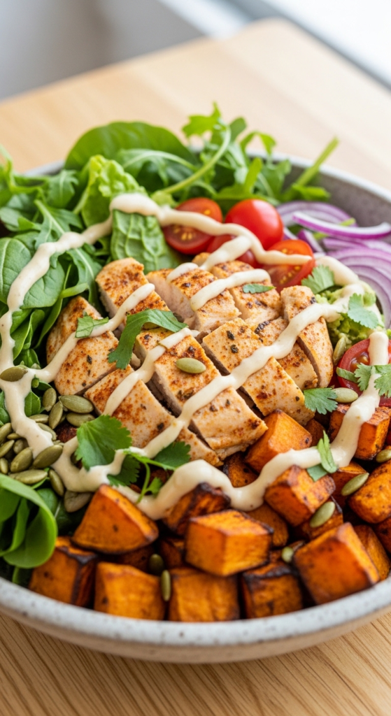 Start with a base of fresh greens (arugula or kale). Arrange the roasted sweet potatoes and sliced chicken in distinct sections to create a visual “rainbow” effect. Place a dollop of avocado mash or hummus in the center.