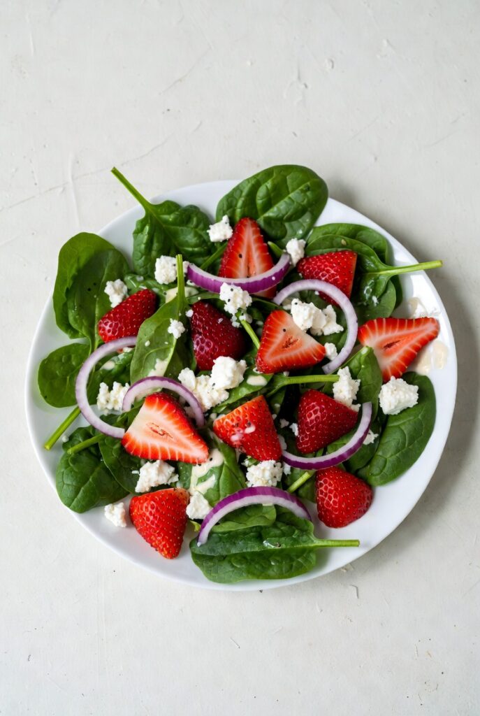 To keep the salad looking “chef-prepared,” do not toss the strawberries and cheese into the bowl. Instead, toss the spinach and dressing first, then lay the berries and cheese over the top. This prevents the white cheese from turning pink and keeps the berries from sinking to the bottom.