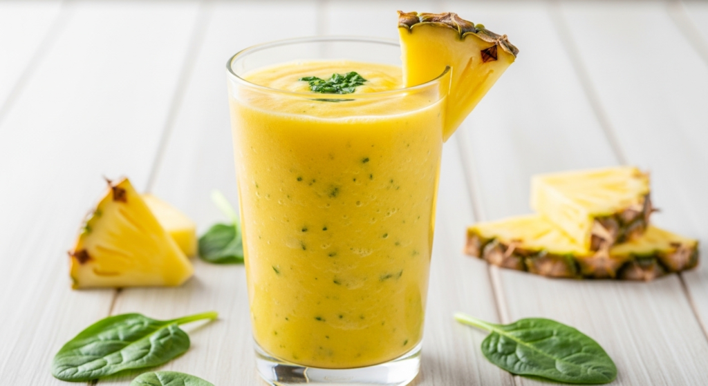 The combination of Ginger and Pineapple creates a powerful anti-inflammatory duo. The addition of Spinach provides a hidden dose of Iron and Vitamin K, while Coconut Water ensures your electrolytes remain balanced, preventing the sluggishness often associated with dehydration.