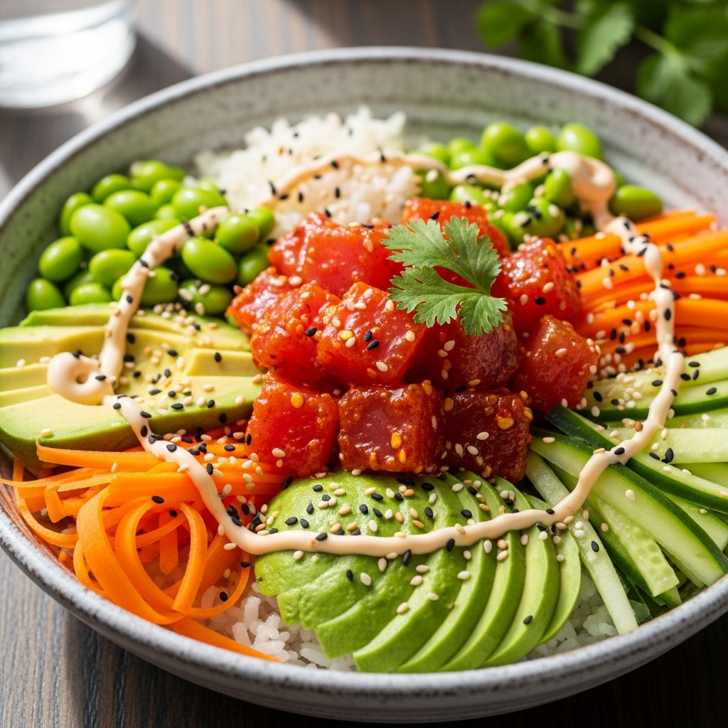 Plating Recommendations: Start with the base in a wide, shallow bowl. Arrange the toppings in distinct “sectors” rather than mixing them immediately; this creates a visual “rainbow” effect that is highly appetizing. Place the tuna in the center as the star of the show.