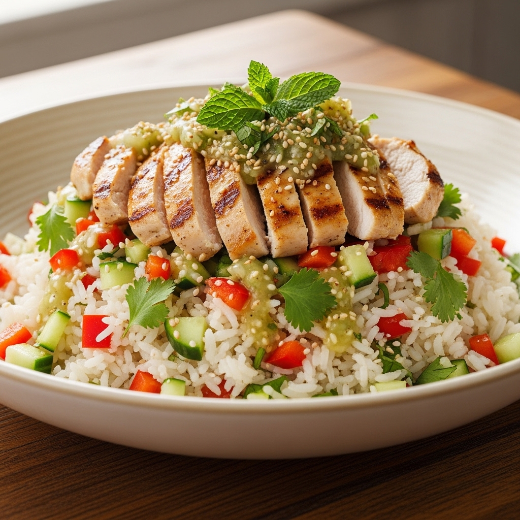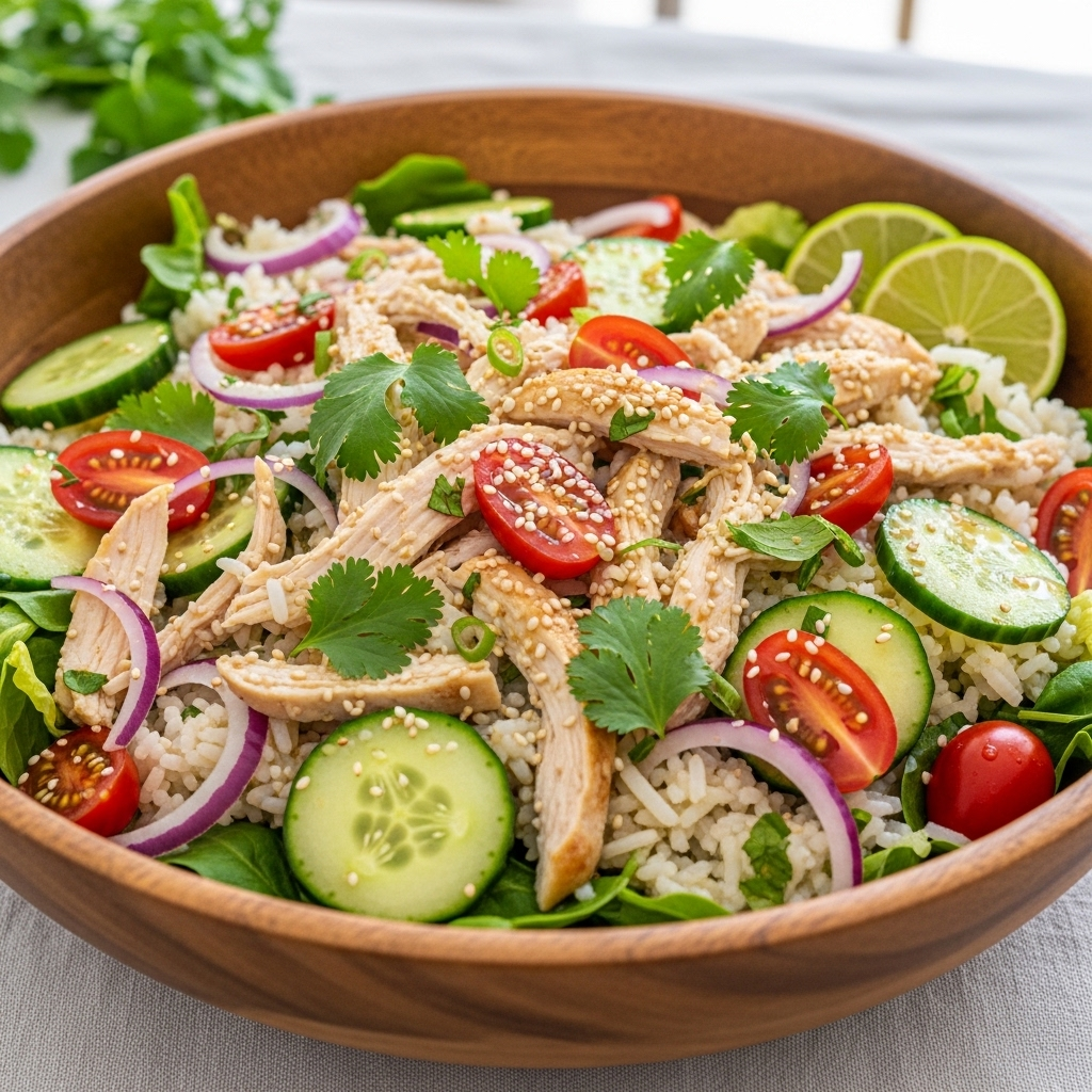 - Reheating: This salad is best served cold or at room temperature. If you prefer warm chicken, reheat only the chicken slices in a pan with a splash of water, then lay them over the cold rice base.